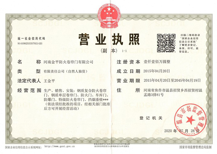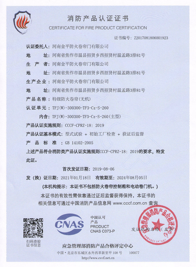 特級防火卷簾(折疊提升式)3C證書(shū)